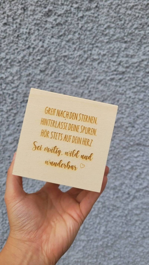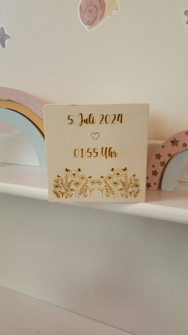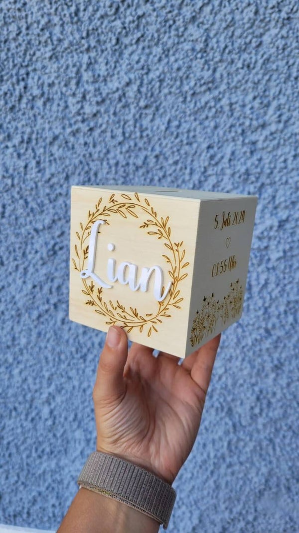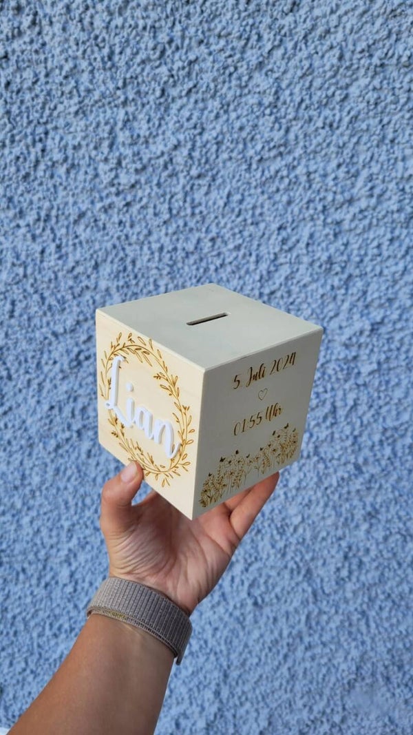 personalisierte Holz Würfel Spardose mit Gravur auf 4 Seiten: Namen, Geburtsdaten und Spruch "Sei mutig, wild und wunderbar" & Blumenwiese