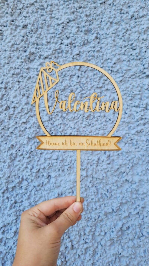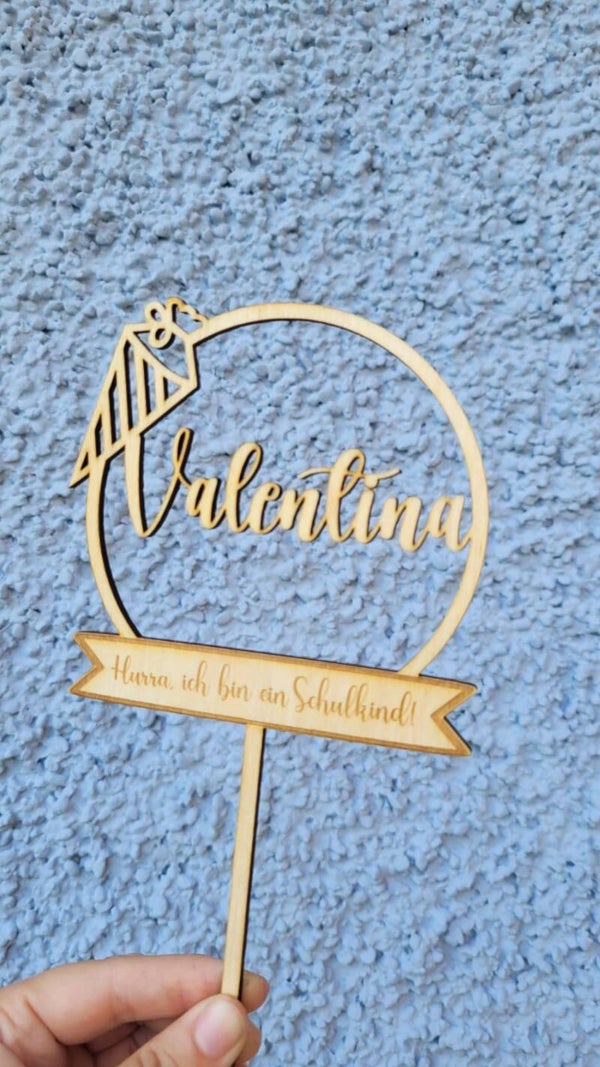 Cake Topper Schulbeginn aus Holz, personalisiert mit Namen, Durchmesser 15cm, individuell und ein Unikat