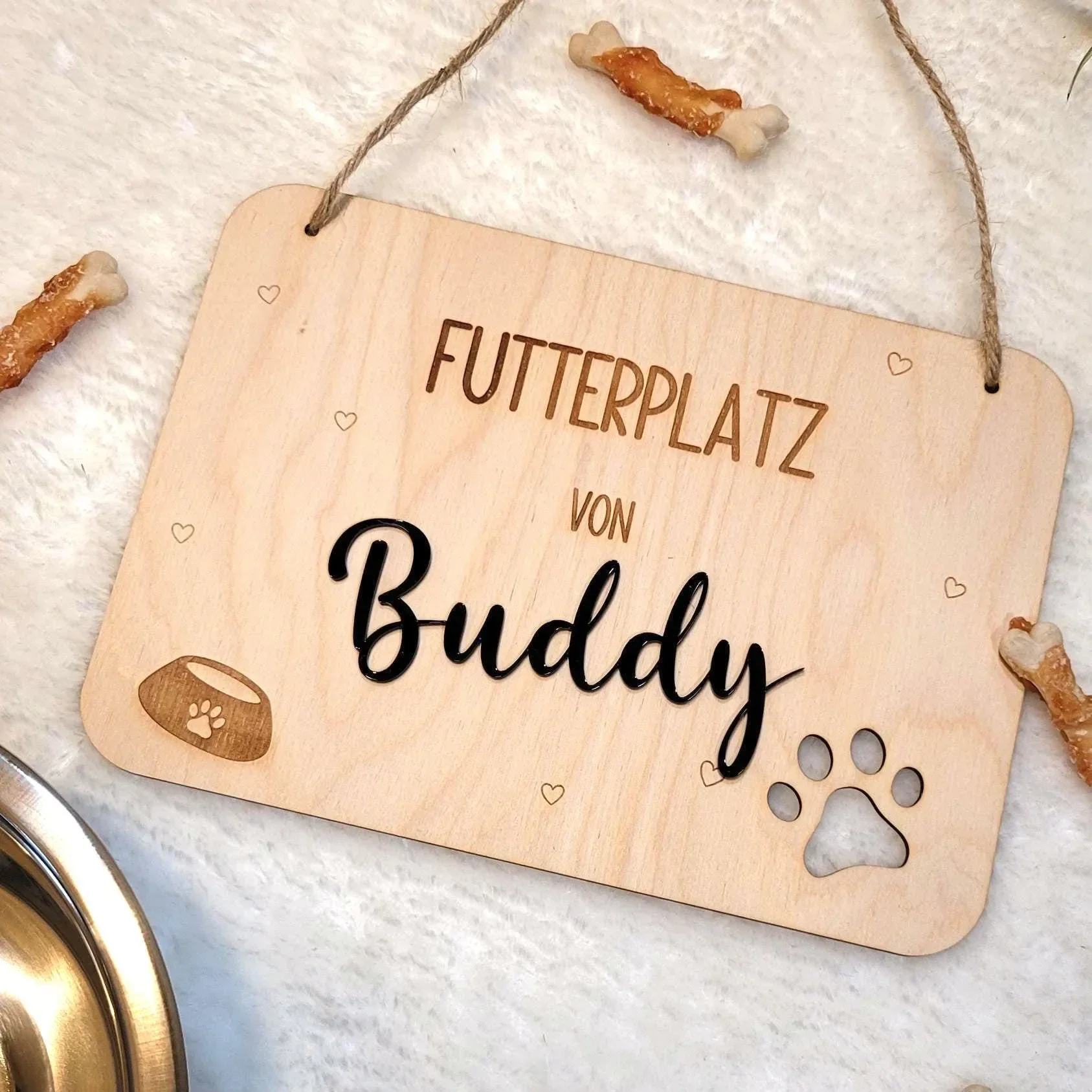 Personalisiertes Schild mit Namen - Futterplatz ,"Hier krümelt", für Hund & Katze, Handgefertigtes Schild Holz, Geschenkidee Weihnachten