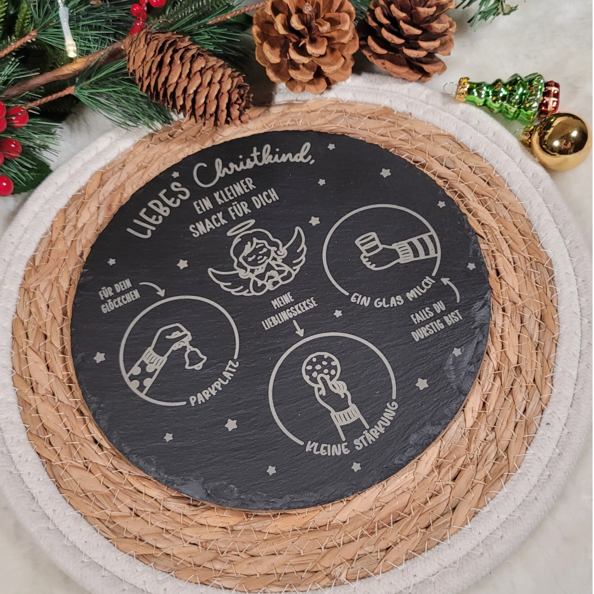 Mach Heiligabend zu etwas ganz Besonderem! âš Mit unserer liebevoll gestalteten Schieferplatte für das Christkind schaffst du eine zauberhafte Tradition, die Kinderaugen zum Leuchten bringt. Platz für Kekse, Milch und ein Glöckchen sorgt dafür, dass das Christkind herzlich empfangen wird.