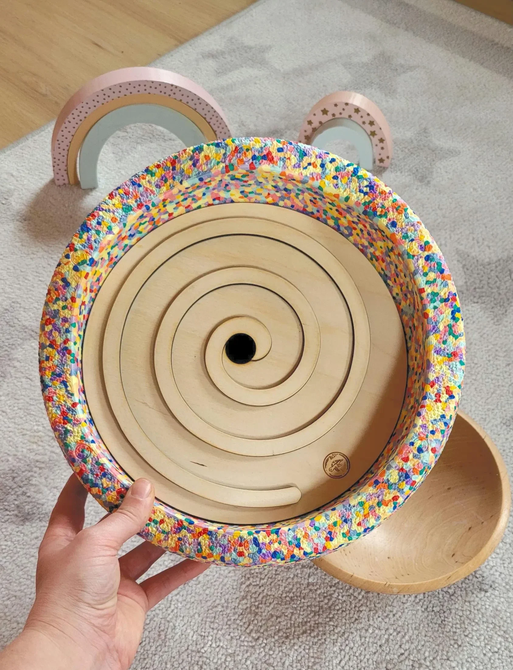 Die Aktivitätsplatte Murmelbahn / Spiralplatte aus naturbelassenem Schichtholz erweitert die Nutzung von Stapelsteinen & Balanciersteinen um gezielte motorische & kognitive Übungen.