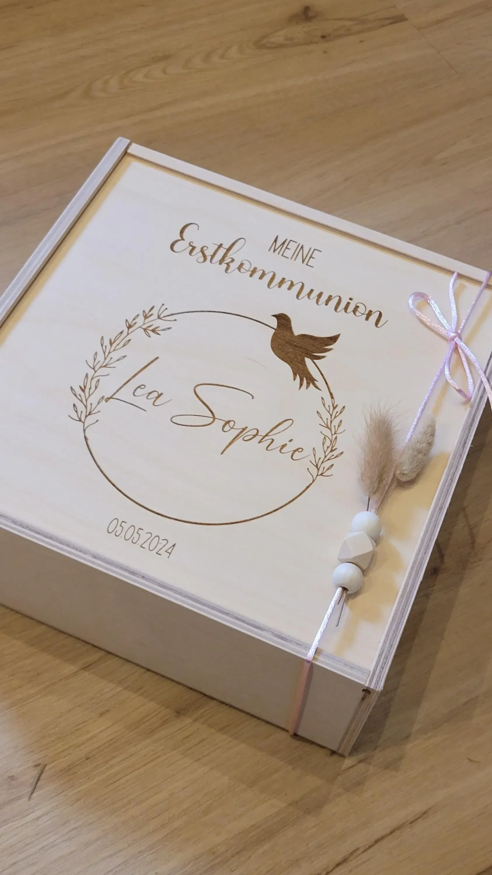 Personalisierte Erinnerungsbox zur Erstkommunion – Holz-Schatzkiste mit Name & Motiv Blumenkranz – Geschenkidee für Paten, Oma, Großeltern 🎁✨