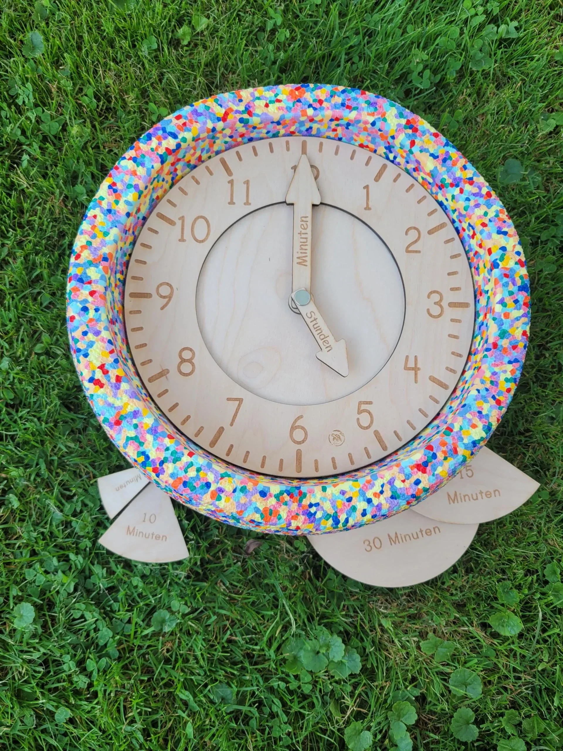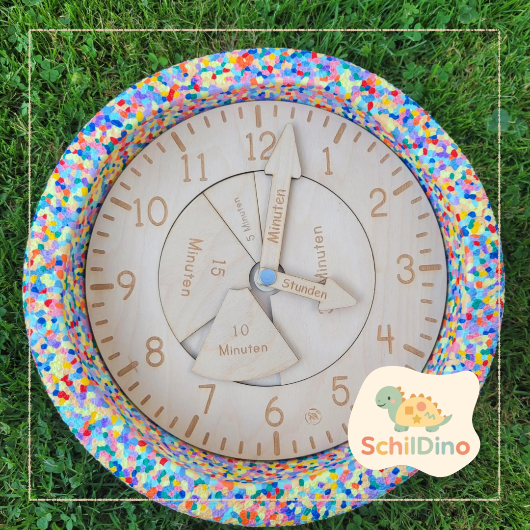 Das liebevolle und kindgerechte Uhr Design bietet 2 Zeiger: Ideal um dir Uhrzeit zu lernen und ausprobieren! Zusätzlich können 5, 10, 15 und 30 Minuten eingelegt werden. Die Zeiger sind mit einer Schraube fixiert und somit auch komplett fixier oder lockerbar!